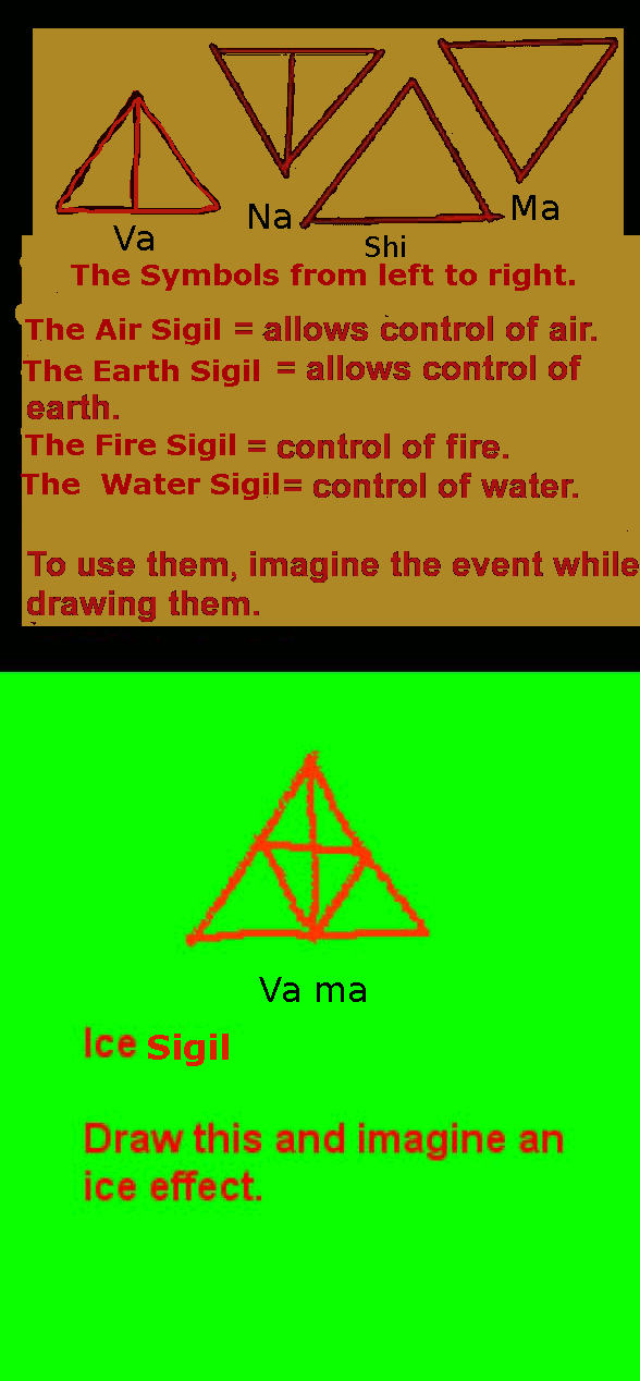 The four elementsThe 4 elements are rarely seen except when you think to see them. Na is Earth or trust, Ma is Water or flow, Shi is Fire or surrender, Va is Air or faith. If I may I will use sky as Ya for space. These are the sounds of the elements as es or val, is, me, en, em or earth, water, fire, air, space. Amongst their interchanges are mixtures such as mud along with a different element seeming ice or water with cold airflow, gravity otherwise air earth, air fire or heat, fire water thats steam due to fire or heat that doesn't quit till it goes out, some lava or earth fire. Due note: Faith is simply the acknowledgement that there is something vaster than your individuated aspect of self. Trust is the belief that not only is there something bigger than you or what you have, that bigger something has your back. These five elements operate with each other & transform to another element. Two stones which are earth element, when create friction ignite fire. Water put on this fire will transform seen with use to air. The space or sink is where this occurs. There is a sound or shape for each element in nature by you or by your feel. | |